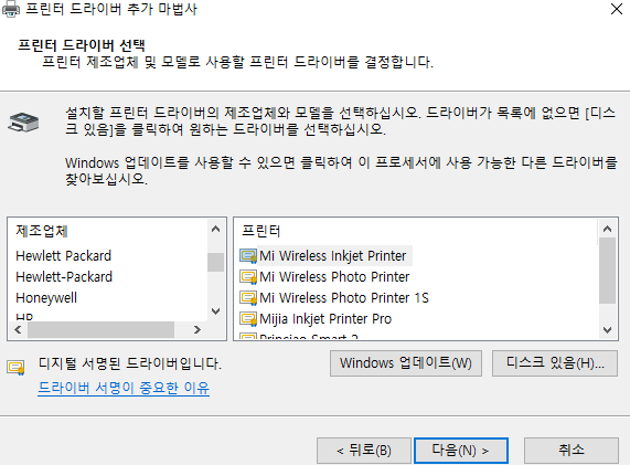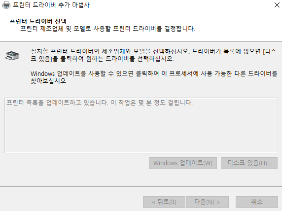 3-2. 프린터 드라이버 추가 마법사에서 Windows 업데이트(W)를 클릭하고 몇분을 기다린다.