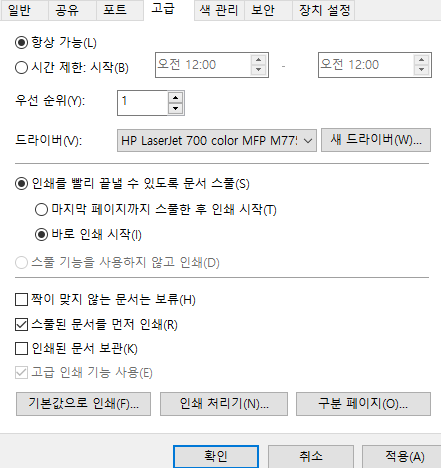 아래 프린터 드라이버가 등록된 드라이버 명과 같다. ('-'하이픈 제외ㅠ 조마조마 했음)