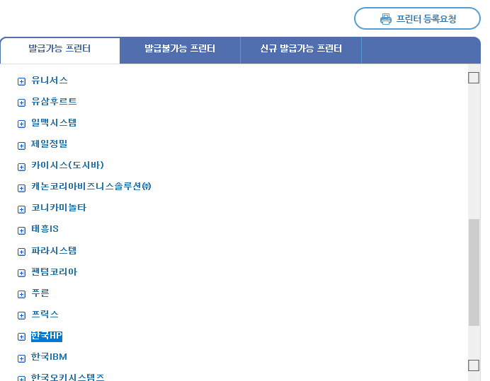- 발급가능 프린터로 등록 요청하지 않은 경우 발급가능프린터 등록 요청으로 바로가기