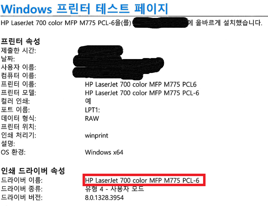 결과적으로 프린터 테스트페이지를 출력해 보면, 다음과 같이 프린터 드라이버가 바뀐 것을 알수 있다.