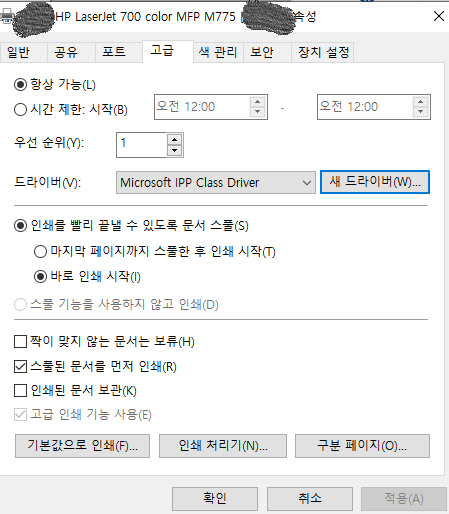 <안되는 경우의 수많은 드라이버중에 하나 - Microsoft IPP Class Driver> : 이런 (호환/가상) 드라이버는 안된다.