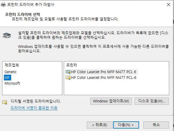 3. 등록된 프린터 드라이버로 기존 드라이버로 교체(Windows Update등을 활용)