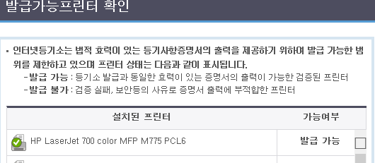 <인터넷등기소 발급가능프린터 확인화면>