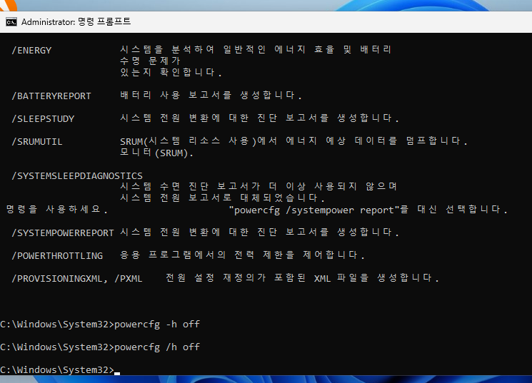 2.2 명령어 powercfg -h off를 입력해 최대 절전 모드를 비활성화한다(재부팅이 필요함).