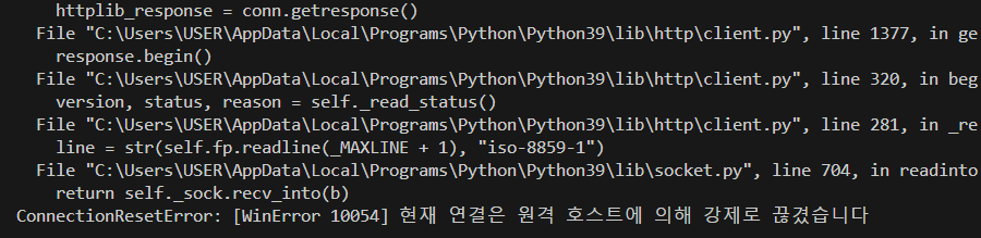 ConnectionResetError: [WinError 10054] 현재 연결은 원격 호스트에 의해 강제로 끊겼습니다