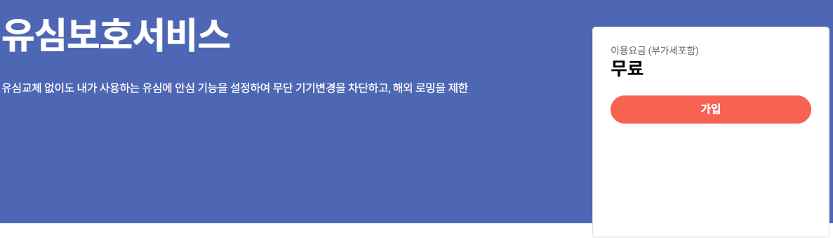 유심보호서비스 : 유심교체 없이도 내가 사용하는 유심에 안심 기능을 설정하여 무단 기기변경을 차단하고, 해외 로밍을 제한
