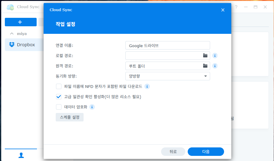 맨위의 그림과 같이 패키지에서 Cloud Sync에서 Google Drive와 동기화를 시도했더니 결국 다음과 같이 동기화 작업 설정 메뉴가 나왔다.