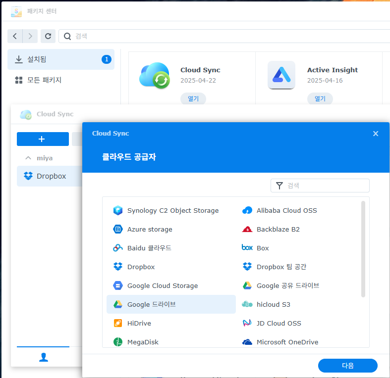 언젠가 패키지중에 Cloud Sync 를 설치하여 Dropbox와 Google Drive를 연동하여서, 클라우드를 잘연동하여 휴대폰과 PC및 NAS에서 동일한 상태의 문서에 접근하여 쓰고 있다.