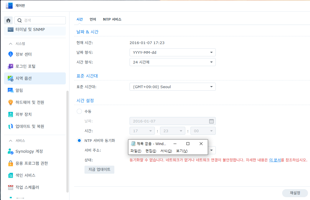 제어판에서 지역옵션에 가서 시간설정에 기존 사설 NTP서버와 동기화를 선택해봤으나 제대로 동작하지 않는다.