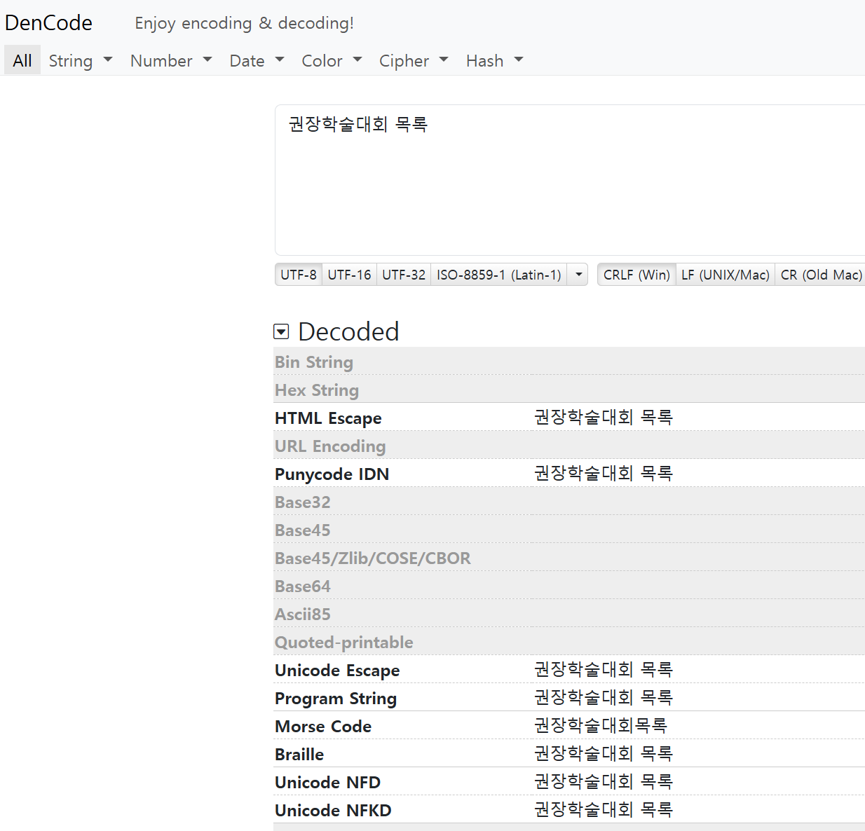 자소분리된 텍스트를 긁어서 아래의 사이트에서 넣어보면(자소분리가 안된것 처럼 보이지만 NFD양식의 글자열임), 그 아래로 자동으로 여러가지 방식으로 디코드 해서 보여주게 된다.